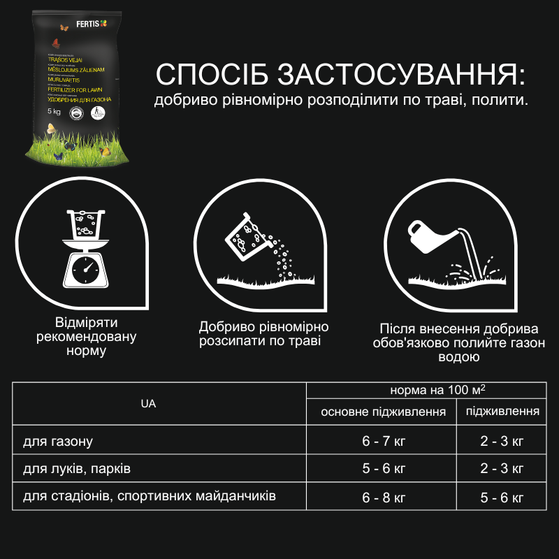 Спосіб застосування: добриво рівномірно розсипати по траві, полити.