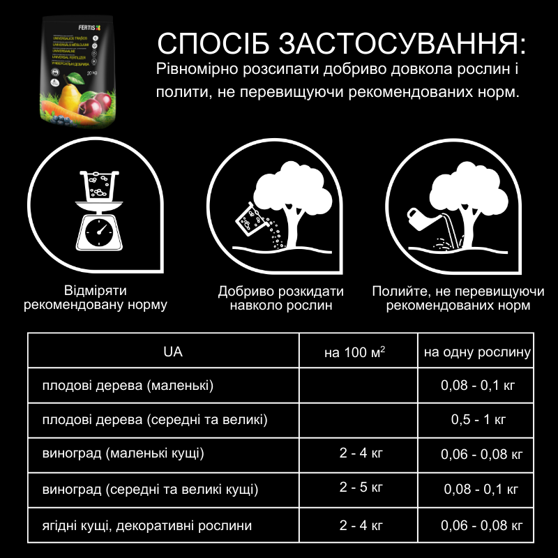 Універсальне комплексне добриво FERTIS ідеально підходить для підживлення всіх видів рослин на вашій присадибній ділянці. Використовуючи його, ви отримуєте здорові потужні рослини та смачний щедрий врожай.